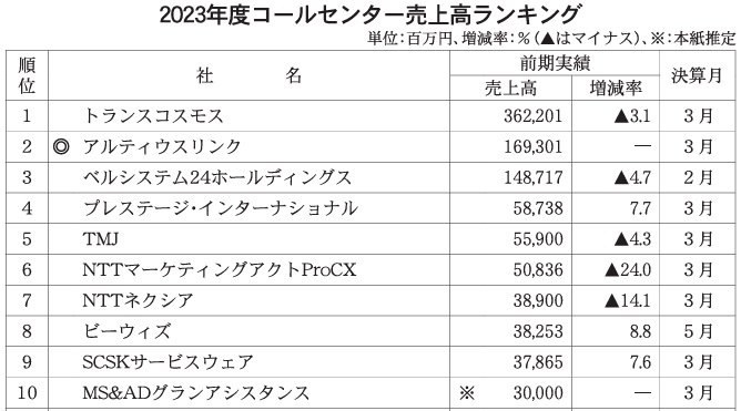 2位はアルティウスリンク。前回の22年度調査で3位のりらいあコミュニケーションズと、4位だったKDDIエボルバが、昨年9月1日に経営統合したもの。代表取締役社長にはりらいあコミュニケーションズの網野孝社長が、代表取締役副社長にはKDDIエボルバの若槻肇社長が就任。統合により事業規模が拡大している。